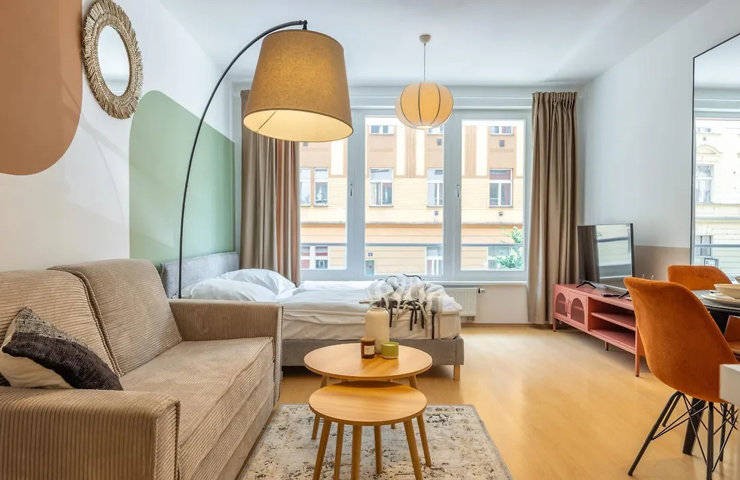 Designer Prague Studio In A Vibrant Neighborhood 아파트는 오래된 프라하에 위치한 훌륭한 호텔입니다. 30㎡ 아파트는 1개의 침실, 1개의 욕실과 부엌을 갖추고 있습니다.